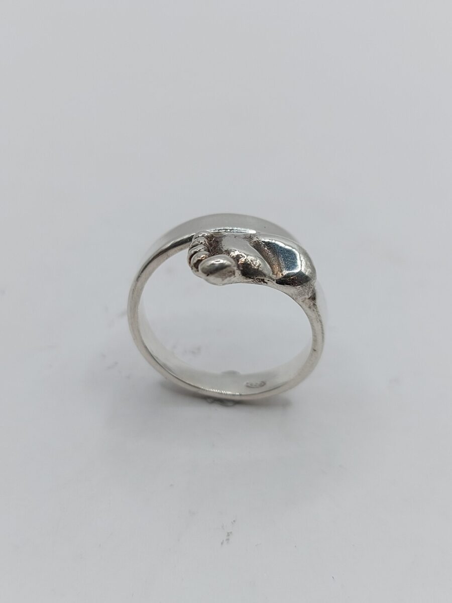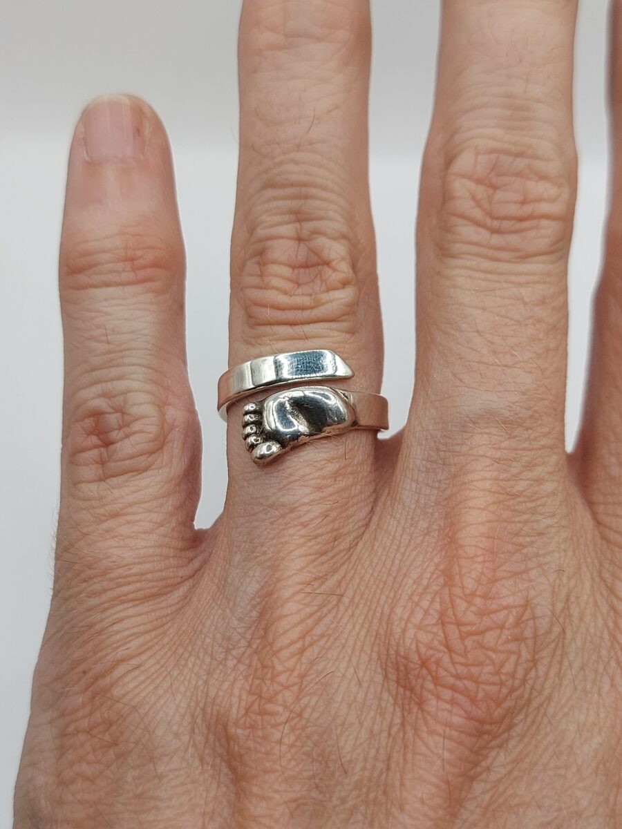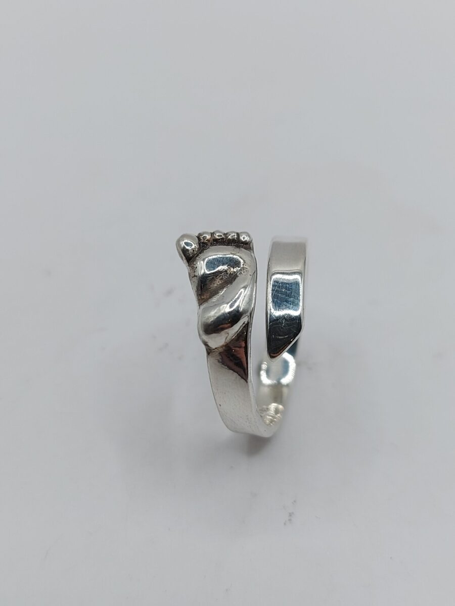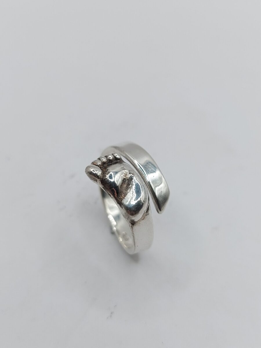 Linea Kids, anello scultoreo raffigurante un piedino neonato in argento 925 anticato.