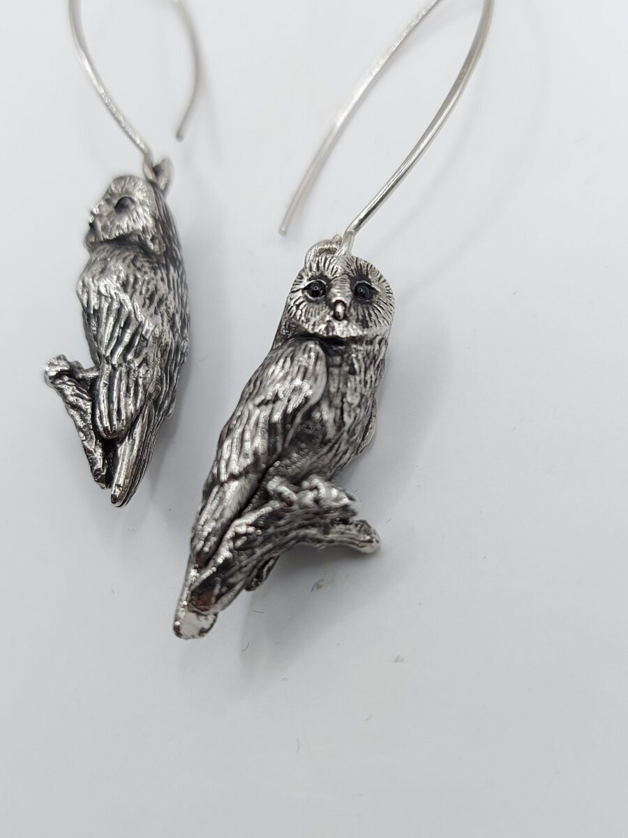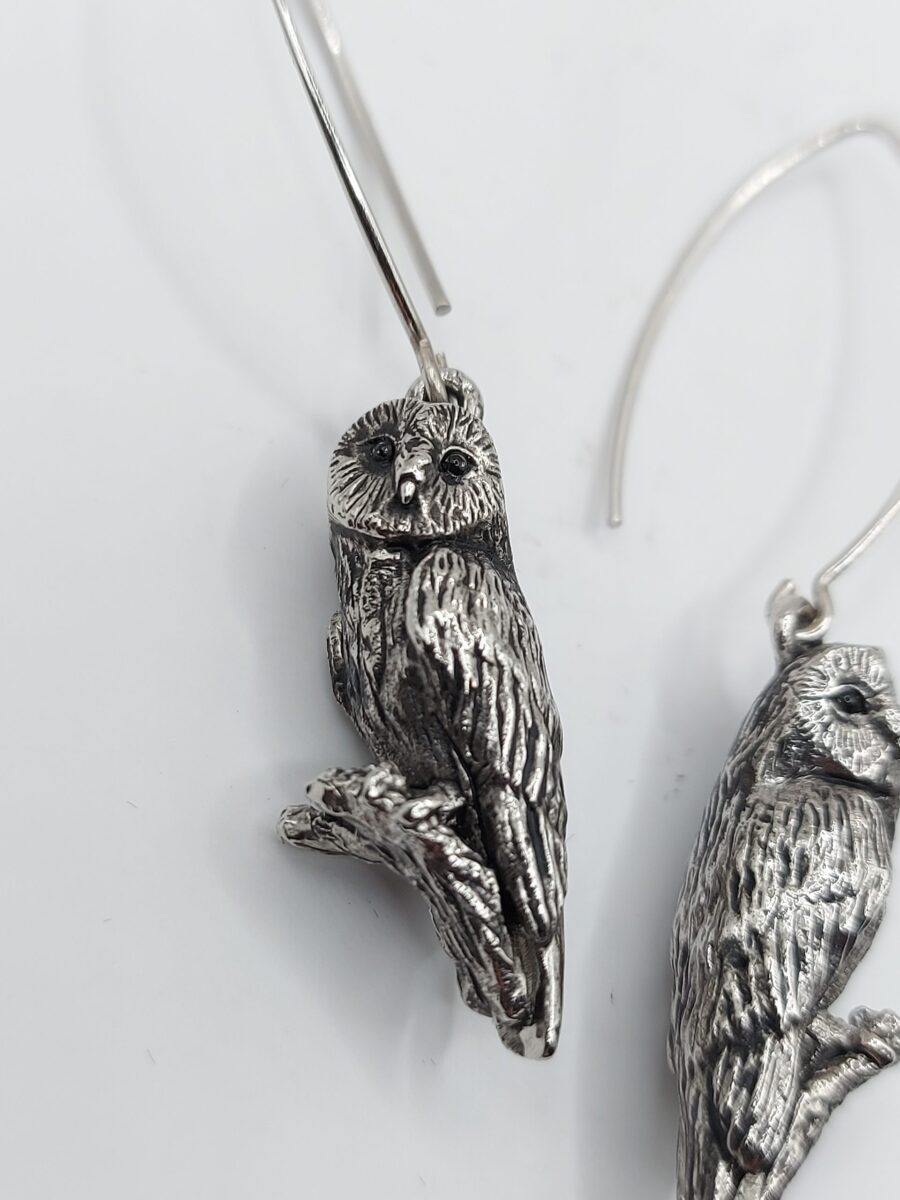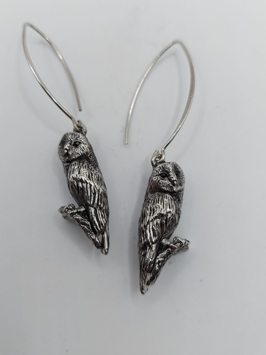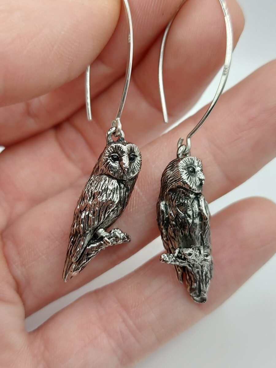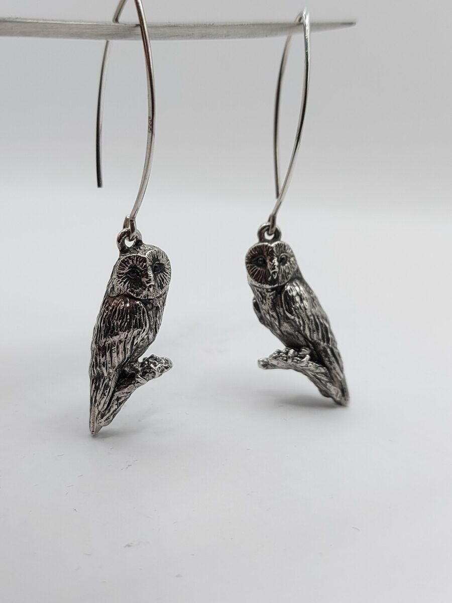 Orecchini pendenti a monachella raffiguranti un Barbagianni a tutto tondo, vuoto all’interno quindi leggero e portabile tutto in argento 925 anticato, altezza del solo barbagianni circa 2cm. Occhi smalto nero.