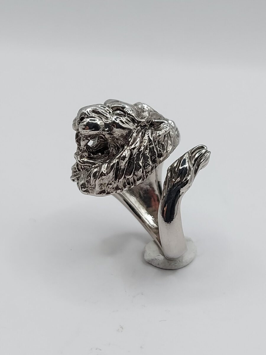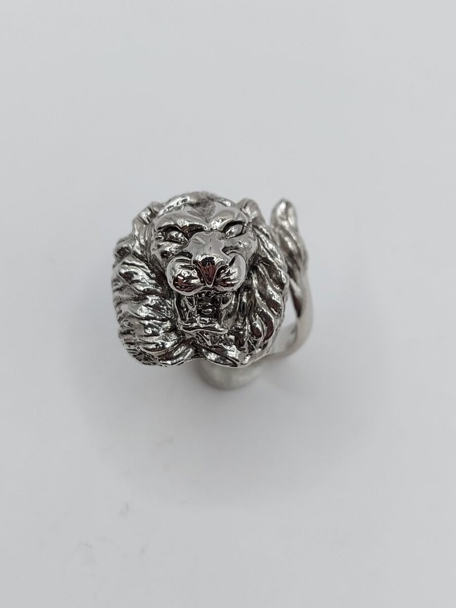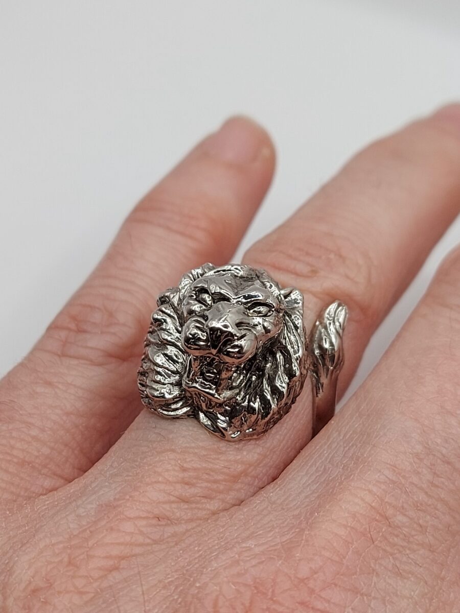 Anello scultoreo raffigurante una testa di leone con coda,  realizzato in argento 925 anticato  regolabile ma comunque su misura  (vedi tabella) con tempi tecnici di 4/7 g. lavorativi.