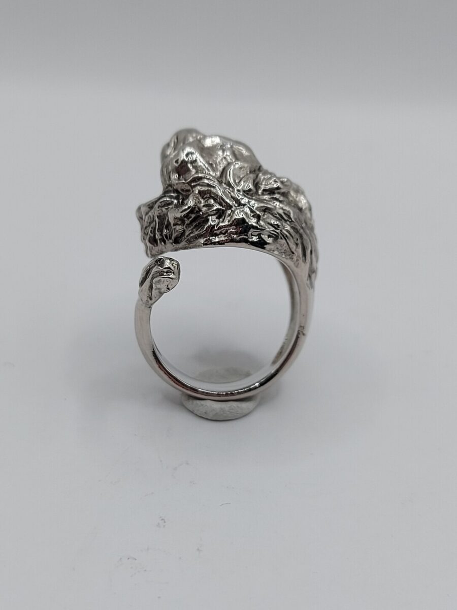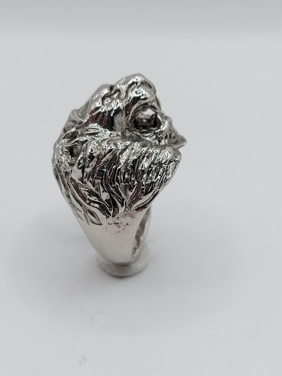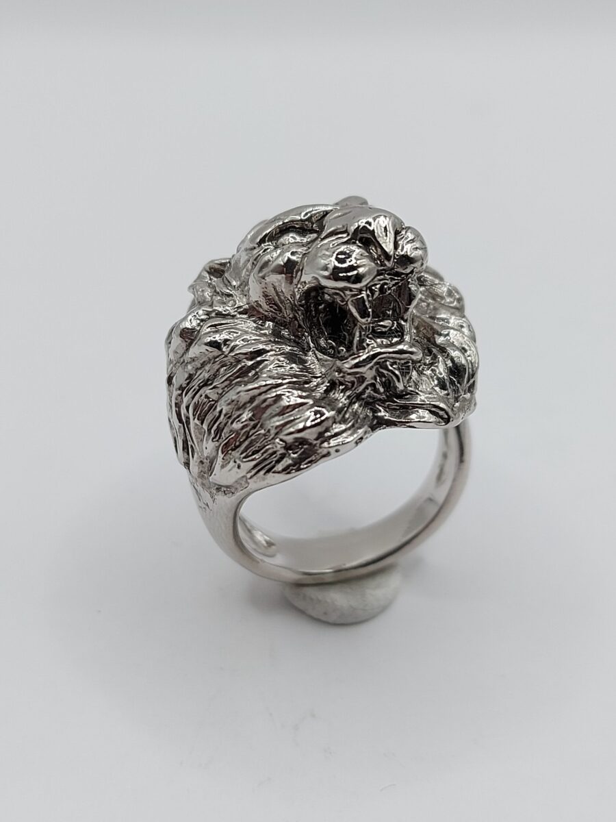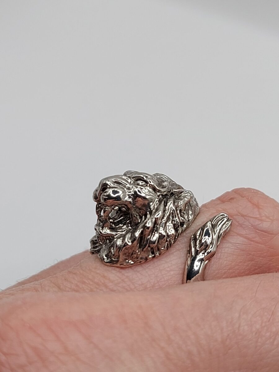 Anello scultoreo raffigurante una testa di leone con coda,  realizzato in argento 925 anticato  regolabile ma comunque su misura  (vedi tabella) con tempi tecnici di 4/7 g. lavorativi.