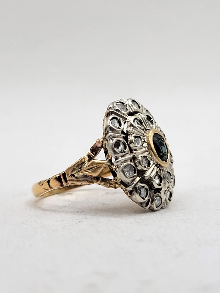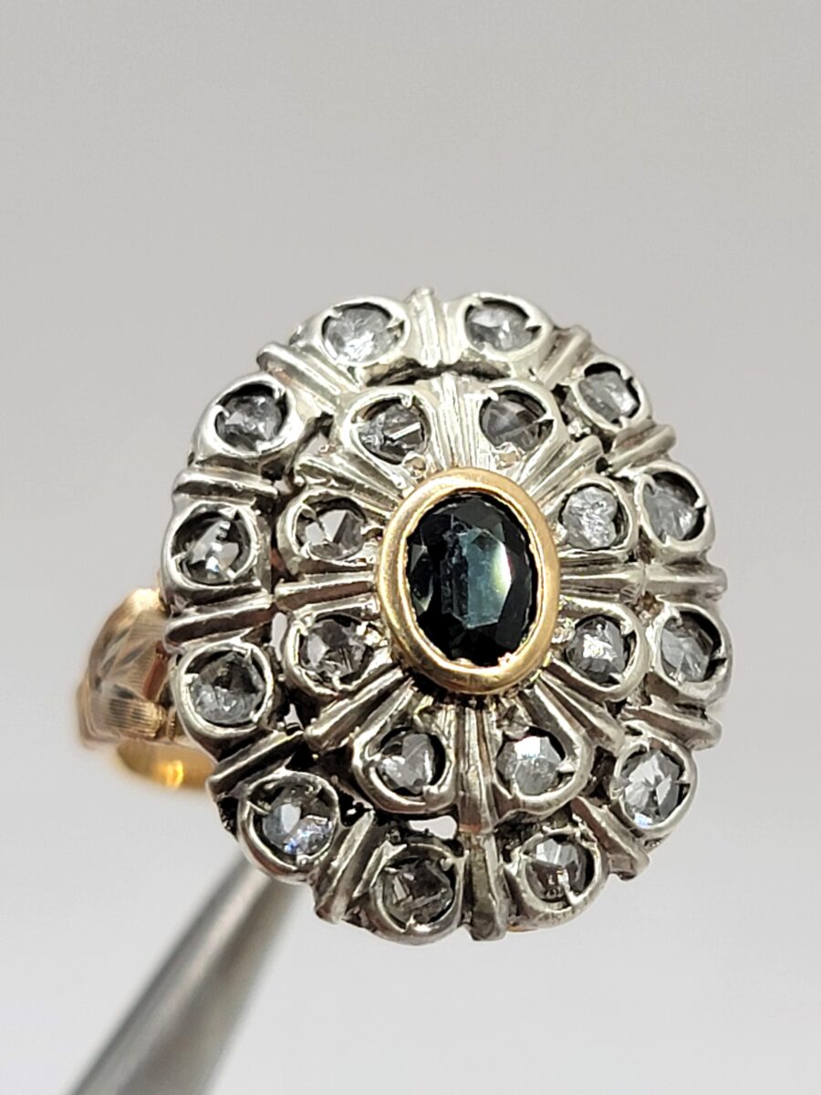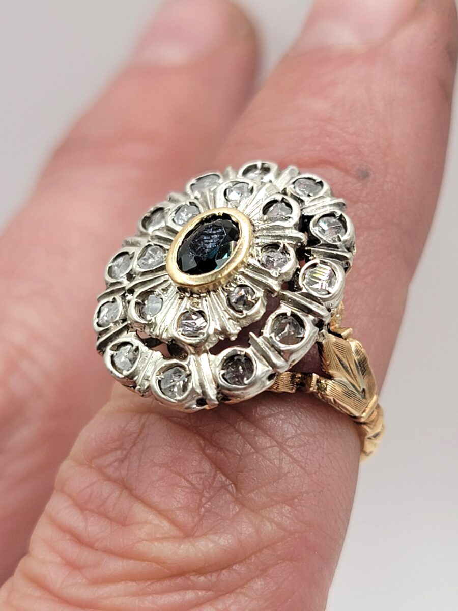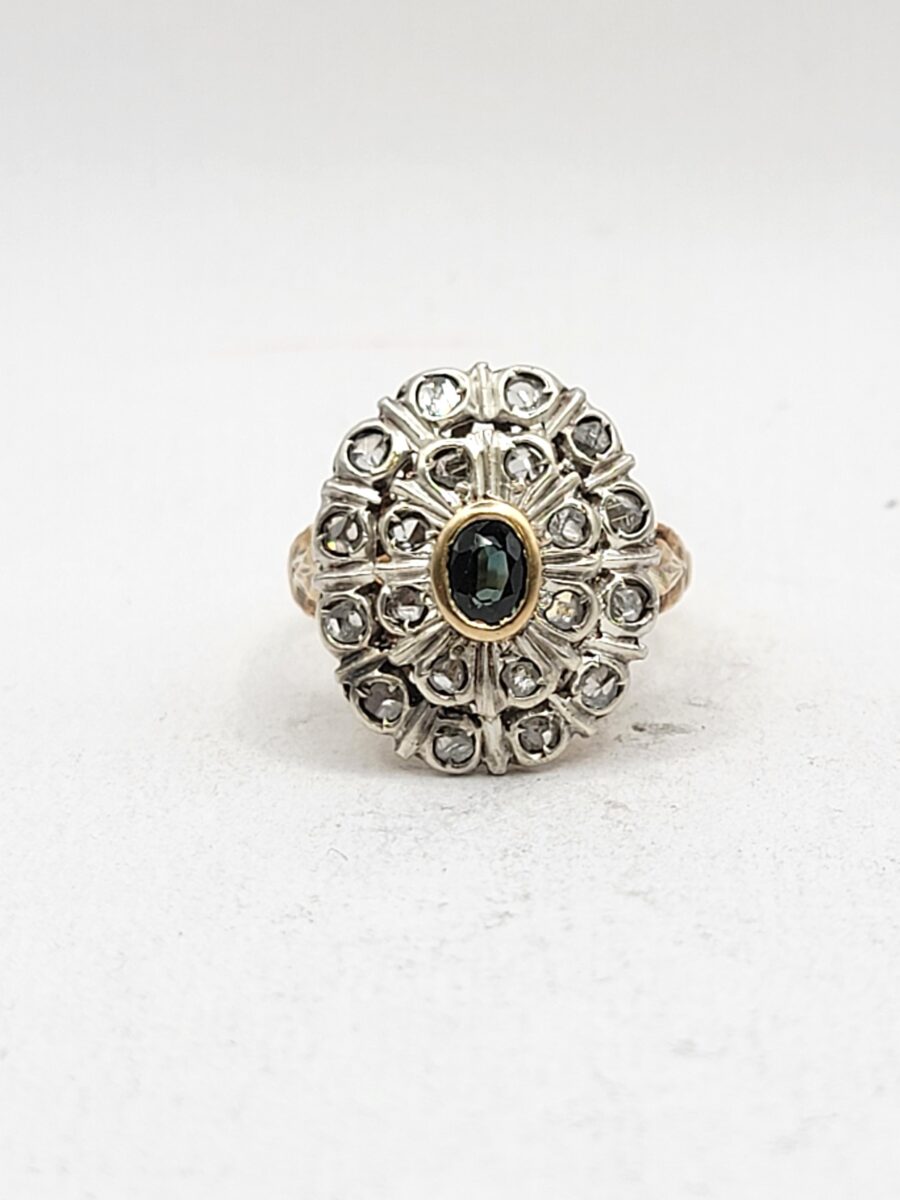 Bellissimo e ottimamente conservato anello margherita in oro e argento con rosette di diamanti e zaffiro naturale centrale. Anello dalle generose dimensioni che non passerà certamente inosservato, risalente circa agli anni 30 in perfetto stile art dèco con richiami floreali come stile richiede, inoltre come solito fare in quell’epoca, la parte esterna a forma ovale è in argento, dove, all’interno  sono state incastonate rosette di diamanti, mentre al centro incorniciato da un filo in oro giallo giallo, troviamo uno zaffiro naturale che aiuta a creare uno scambio cromatico, tra i metalli usati e i colori delle pietre, molto piacevole alla vista. Lavorazione, manco a dirlo, completamente manuale con incisioni laterali a bulino.