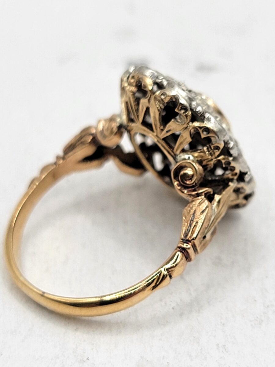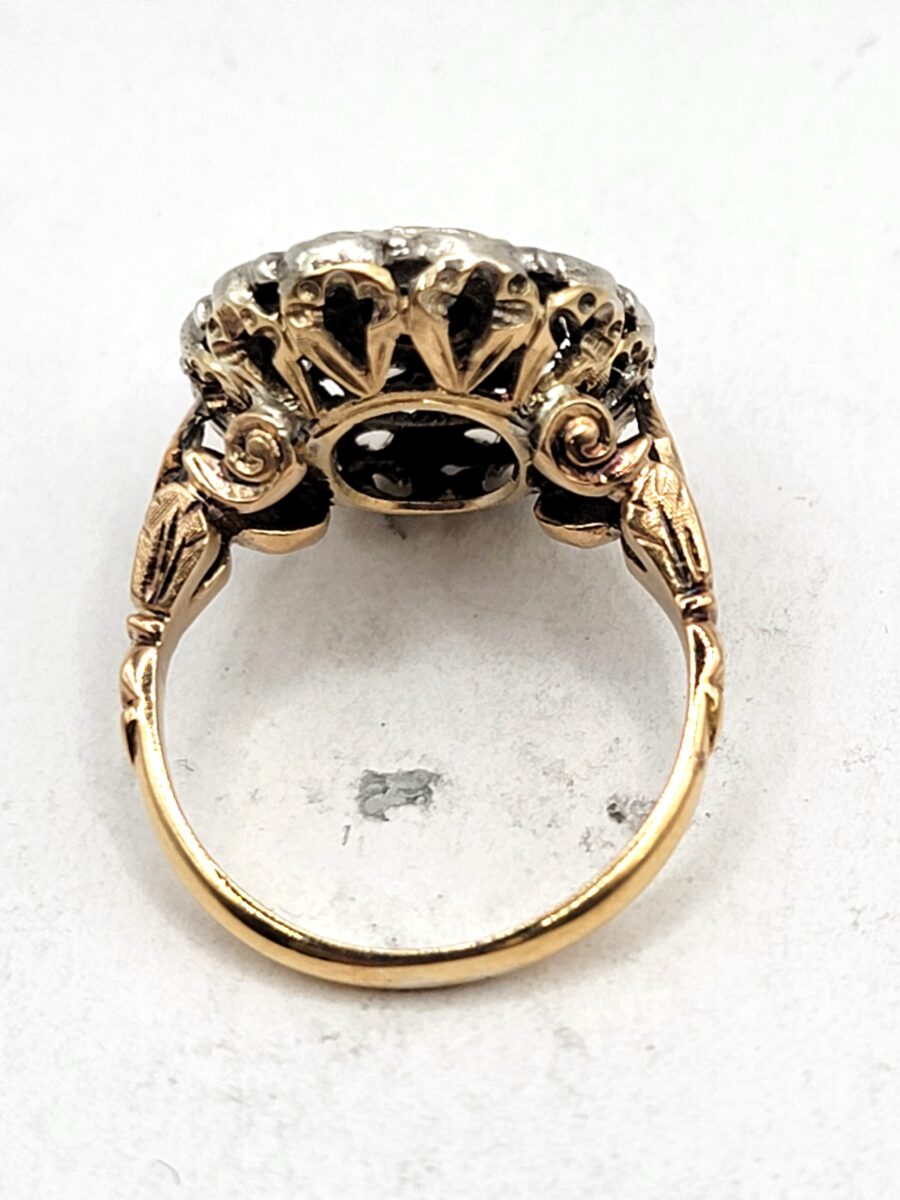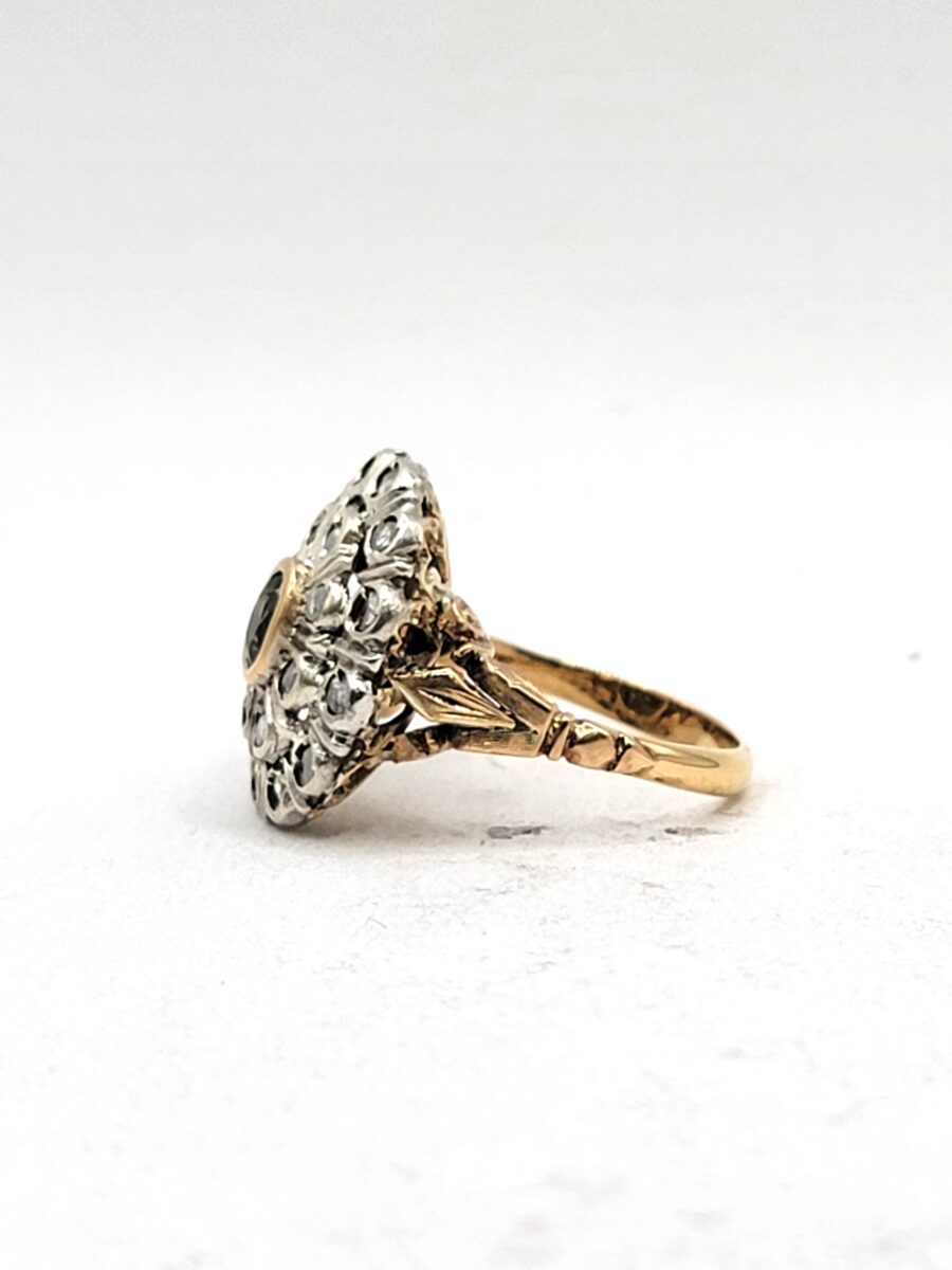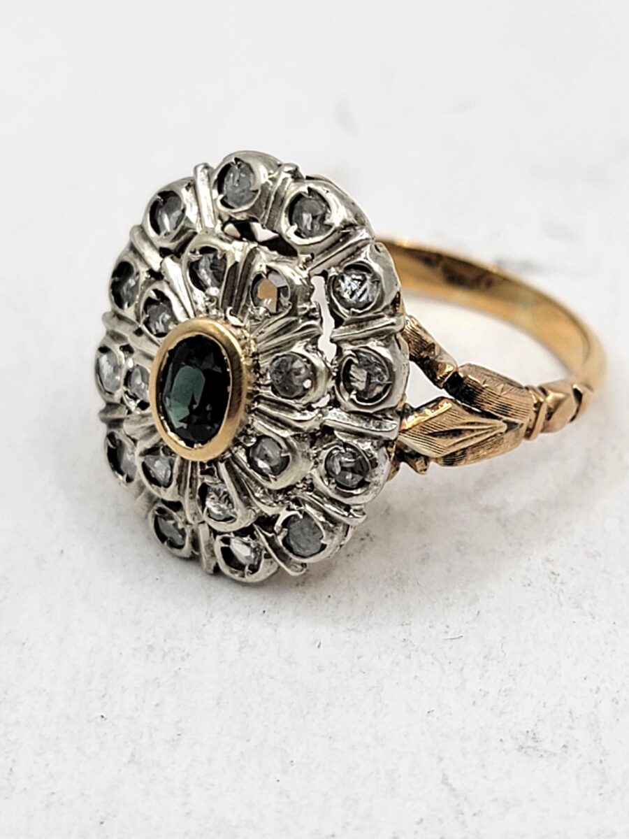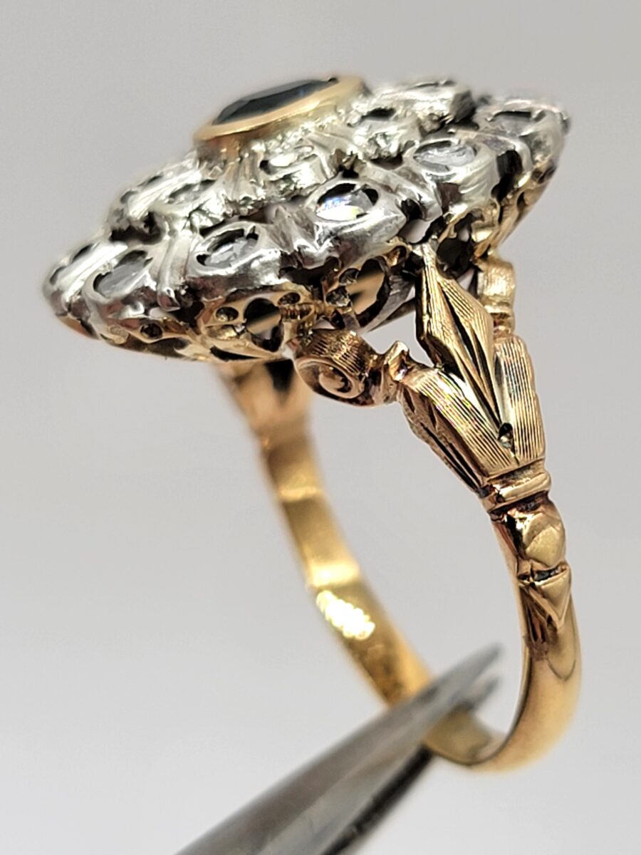 Bellissimo e ottimamente conservato anello margherita in oro e argento con rosette di diamanti e zaffiro naturale centrale. Anello dalle generose dimensioni che non passerà certamente inosservato, risalente circa agli anni 30 in perfetto stile art dèco con richiami floreali come stile richiede, inoltre come solito fare in quell’epoca, la parte esterna a forma ovale è in argento, dove, all’interno  sono state incastonate rosette di diamanti, mentre al centro incorniciato da un filo in oro giallo giallo, troviamo uno zaffiro naturale che aiuta a creare uno scambio cromatico, tra i metalli usati e i colori delle pietre, molto piacevole alla vista. Lavorazione, manco a dirlo, completamente manuale con incisioni laterali a bulino.