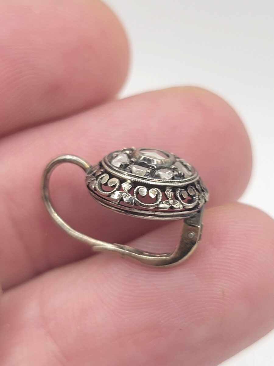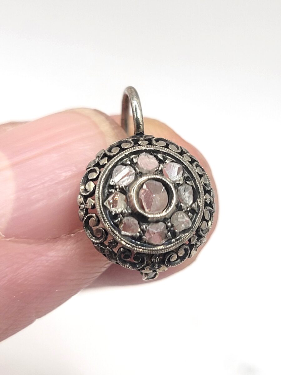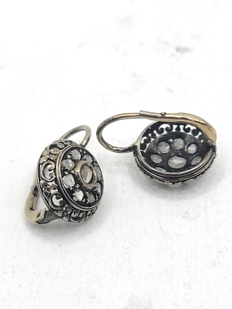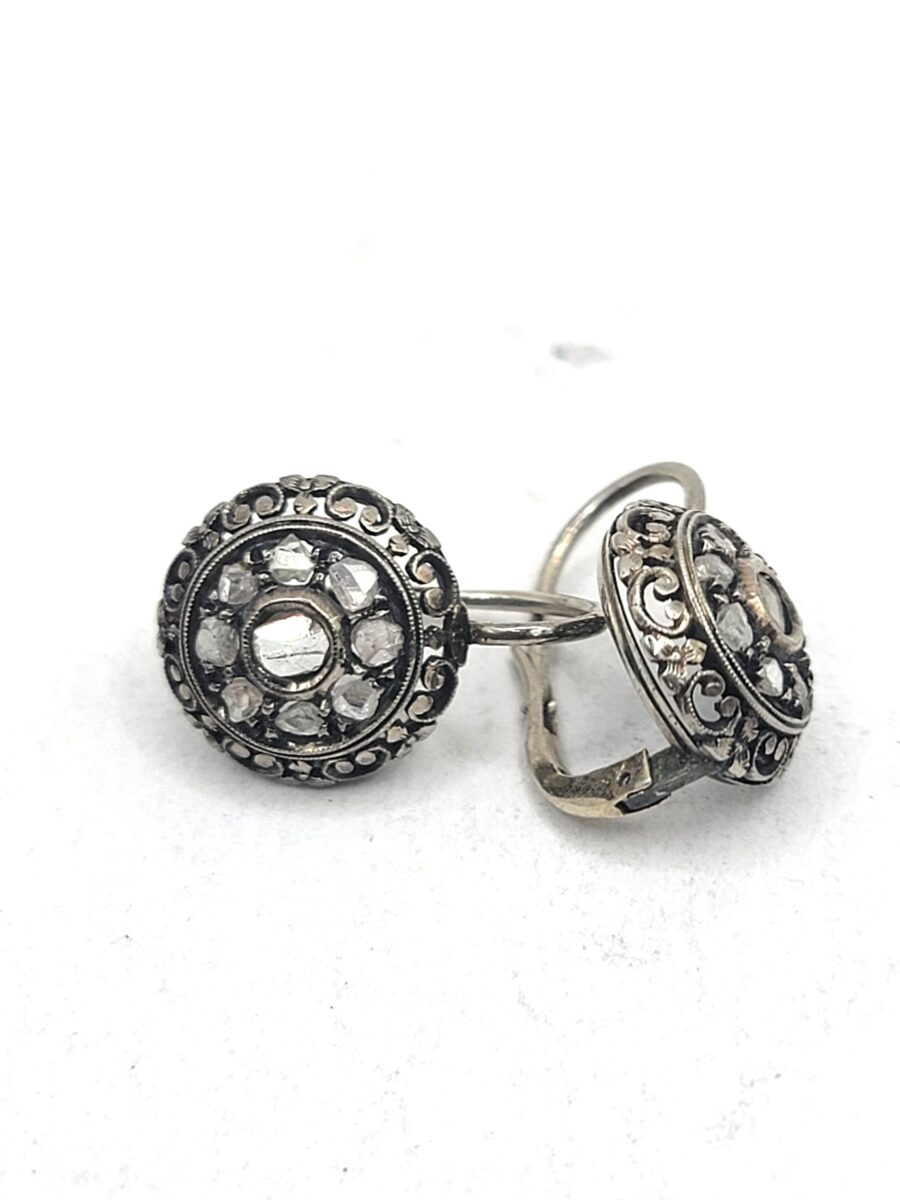 Splendidi orecchini vintage art dèco risalenti circa agli anni 30, in oro bianco 18kt con pavè centrale di rosette di damanti. La caratteristica forma a cerchio e il motivo floreale nel perimetro donano una eleganza senza tempo a questi splendidi gioielli di alto artigianato.