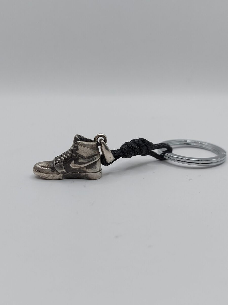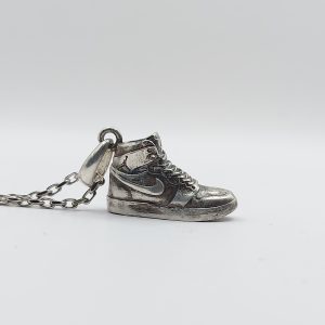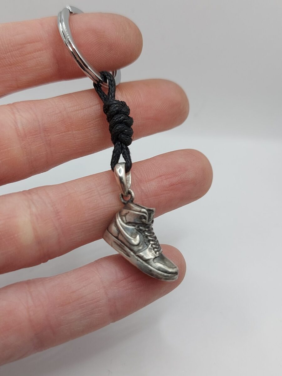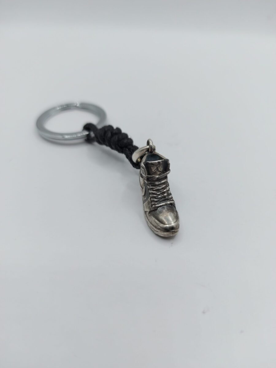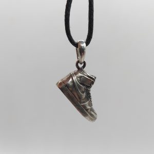 scarpina sneakers basket in argento massiccio anticato, con effetto leggermente consumato, legatura a cordino nero e anella brisè in acciaio inox a facile apertura diametro 25mm.