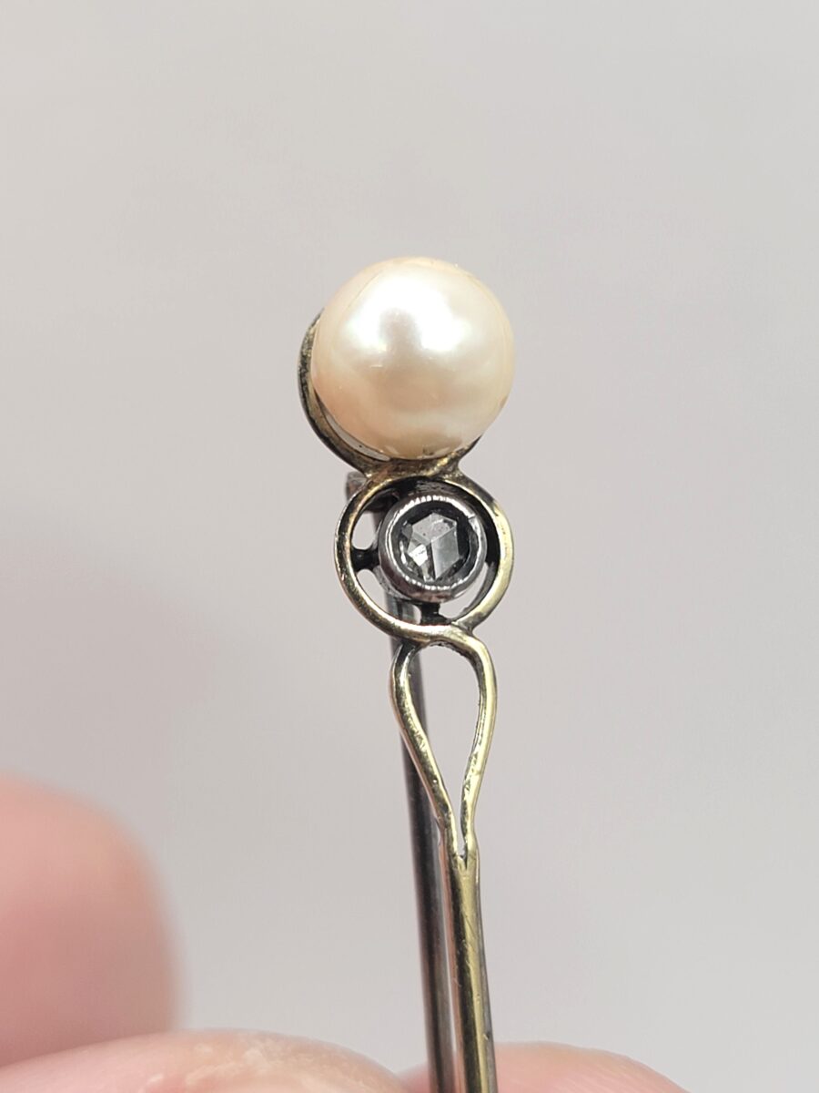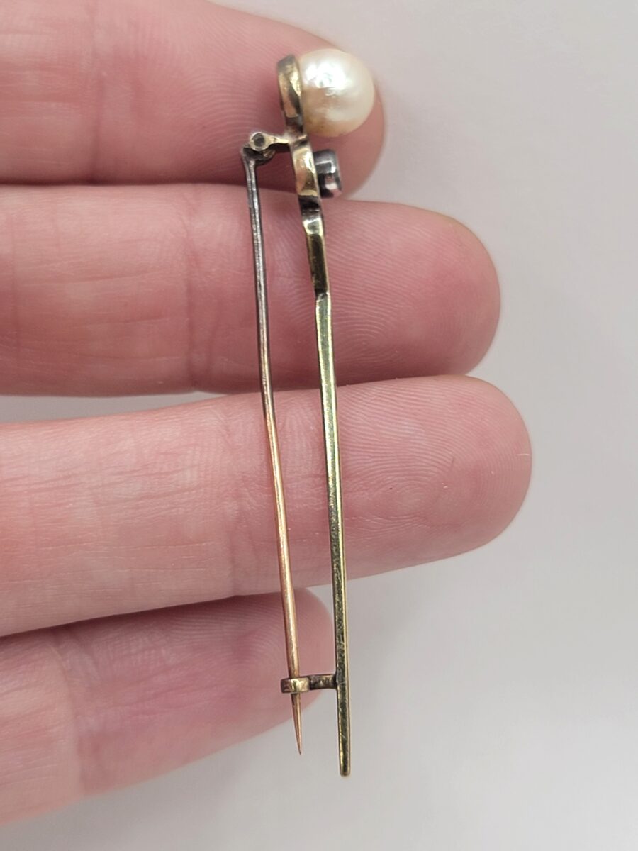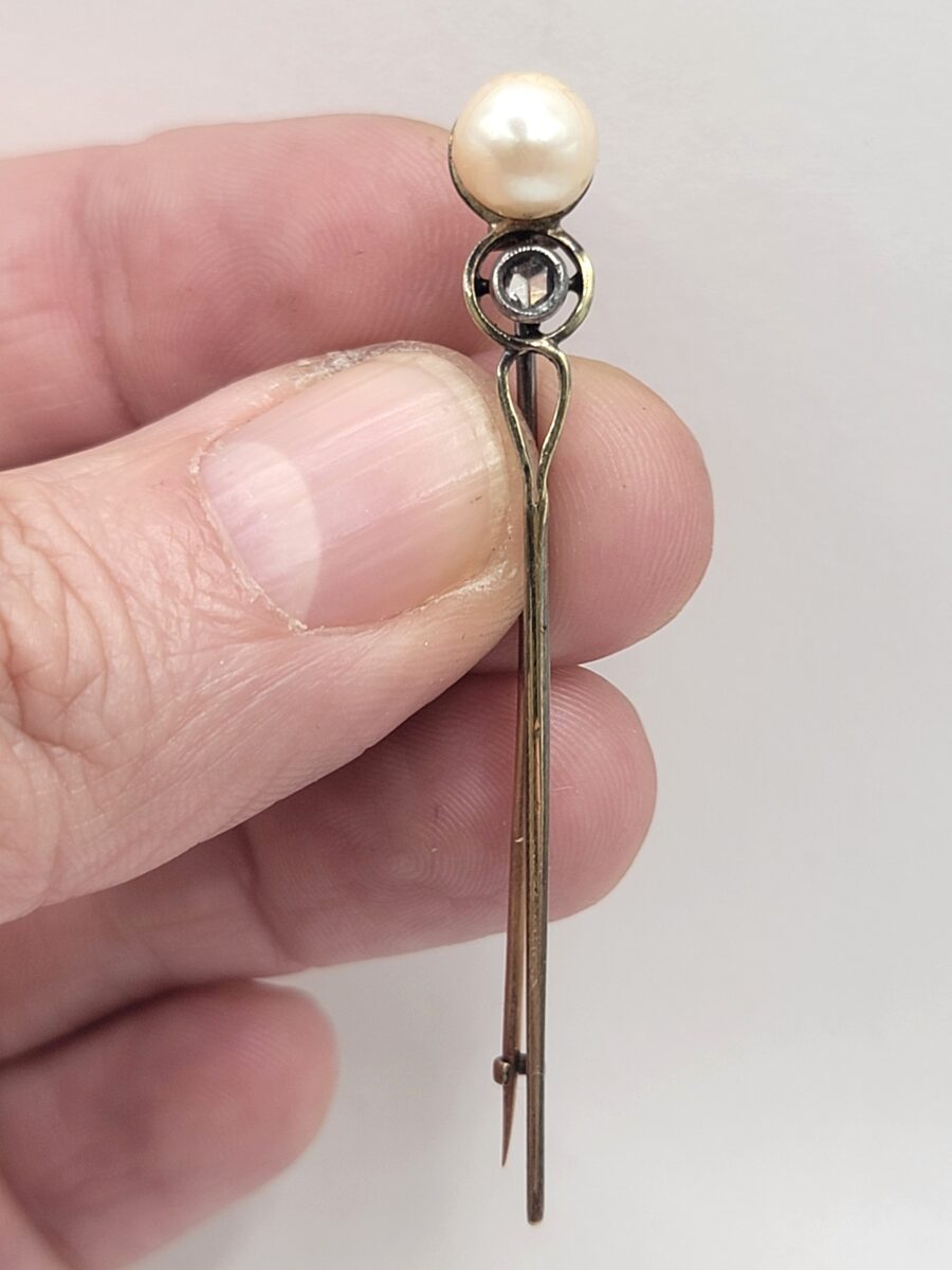 Elegante e antica spilla risalente ai primi del 900 in oro giallo 9kt con perla naturale da 7mm impreziosita ulteriormente con una rosetta di diamanti. Un gioiello d’antiquariato vintage vero, alcuni segni del tempo ne garantiscono l’autenticità.